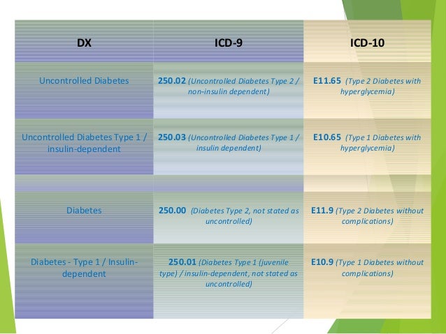 Aims: the diabetes complications severity index (dcsi) converts diagnostic codes and laboratory results into a 14-level metric quantifying the long-term effects of diabetes on seven body systems. adoption of the international classification of diseases, tenth revision, clinical modification (icd-10-cm) necessitates translation from icd-9-cm and. Icd-10-cm code e11 type 2 diabetes mellitus. non-billable. is a complication of diabetes mellitus (predominantly type 2) in which high blood sugars cause severe dehydration, increases in osmolarity (relative concentration of solute) and a high risk of complications, coma and death. type 2 diabetes mellitus' the icd-10-cm alphabetical. Icd-10 code e11. 9 for type 2 diabetes mellitus without complications is a medical classification as listed by who under the range endocrine, nutritional and metabolic diseases. services and is therefore considered not medically necessary icd-10 e0800 e139 diabetes mellitus o24011 o2493 diabetes mellitus in